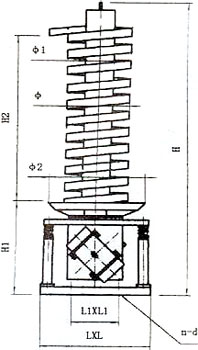 ZC系列垂直振動輸送機的驅動裝置振動電機安裝在輸送塔下部,兩臺振動電機對稱交叉安裝,輸送塔由管體和焊接在管體周圍的螺旋輸送槽組成,輸送塔座于減振裝置上,減振裝置由底座和隔振彈簧組成。(見圖一)當垂直輸送機工作時,根據(jù)雙振動電機自同步原理,由振動電機產(chǎn)生激振力,強迫整個輸送塔體作水平圓運動和向上垂直運動的空間復合振動,螺旋槽內的物料則受輸送槽的作用,作勻速拋擲圓運動,沿輸送槽體向上運動,從而完成物料的向上(或向下)輸送作業(yè)。